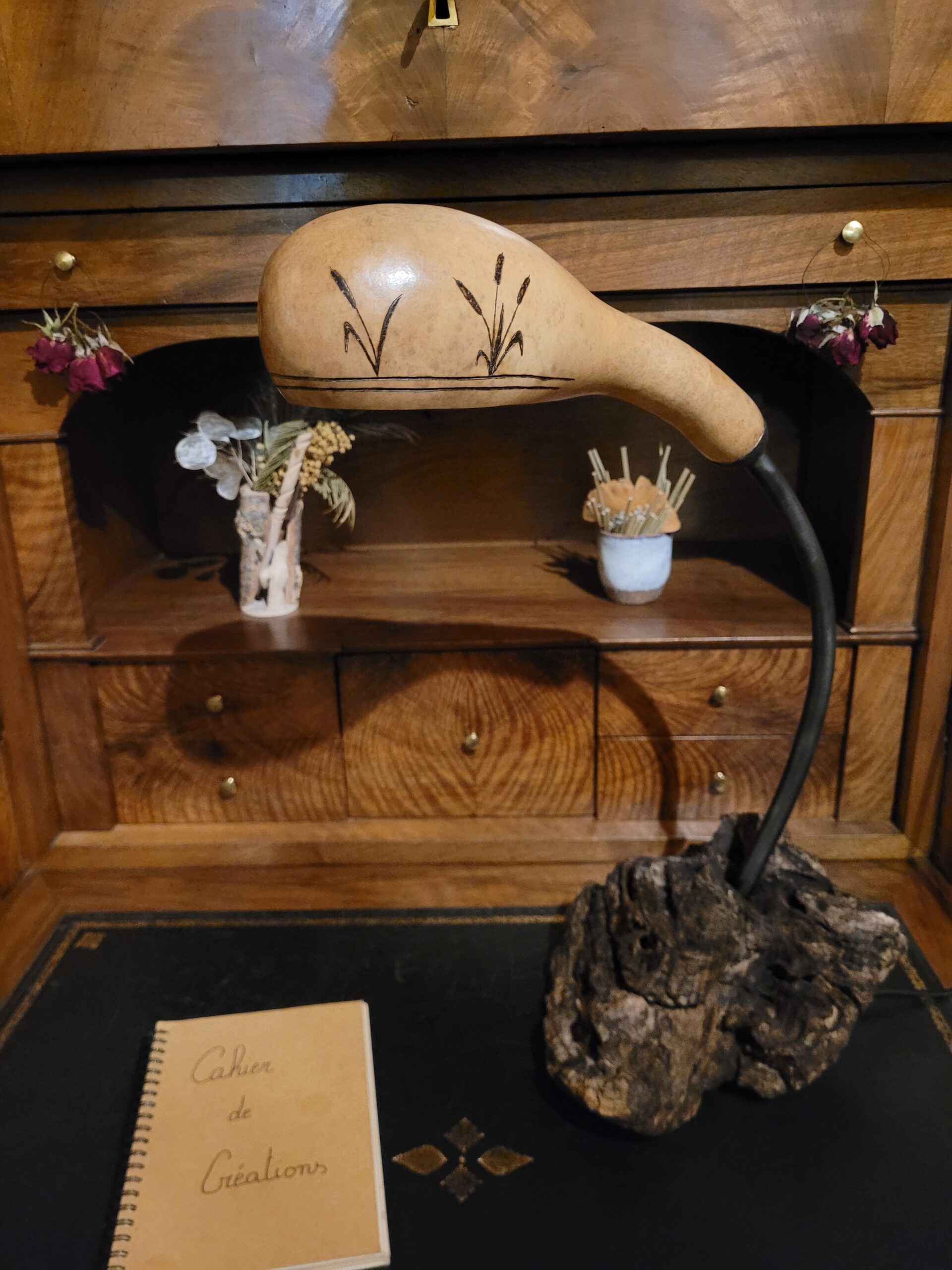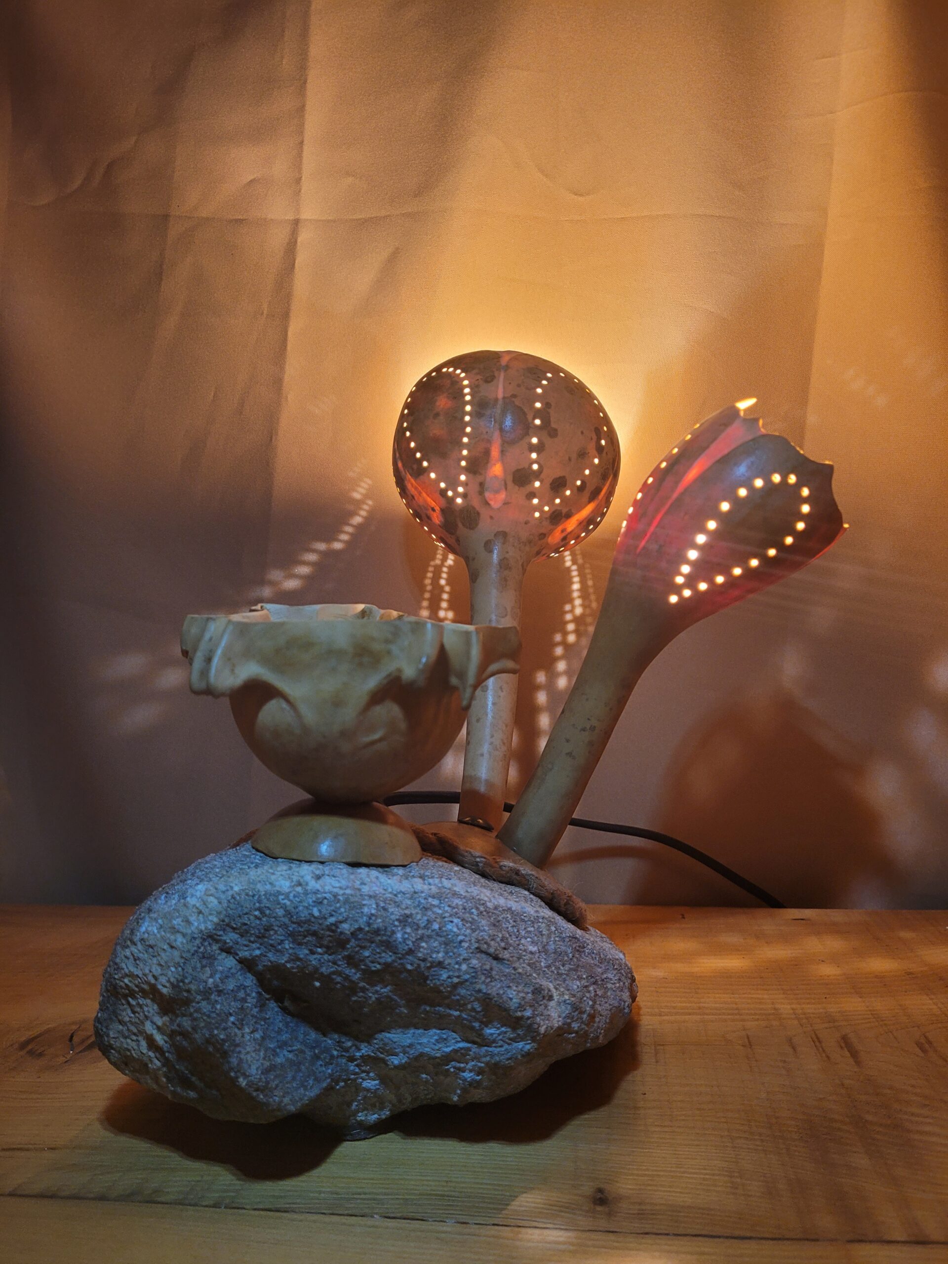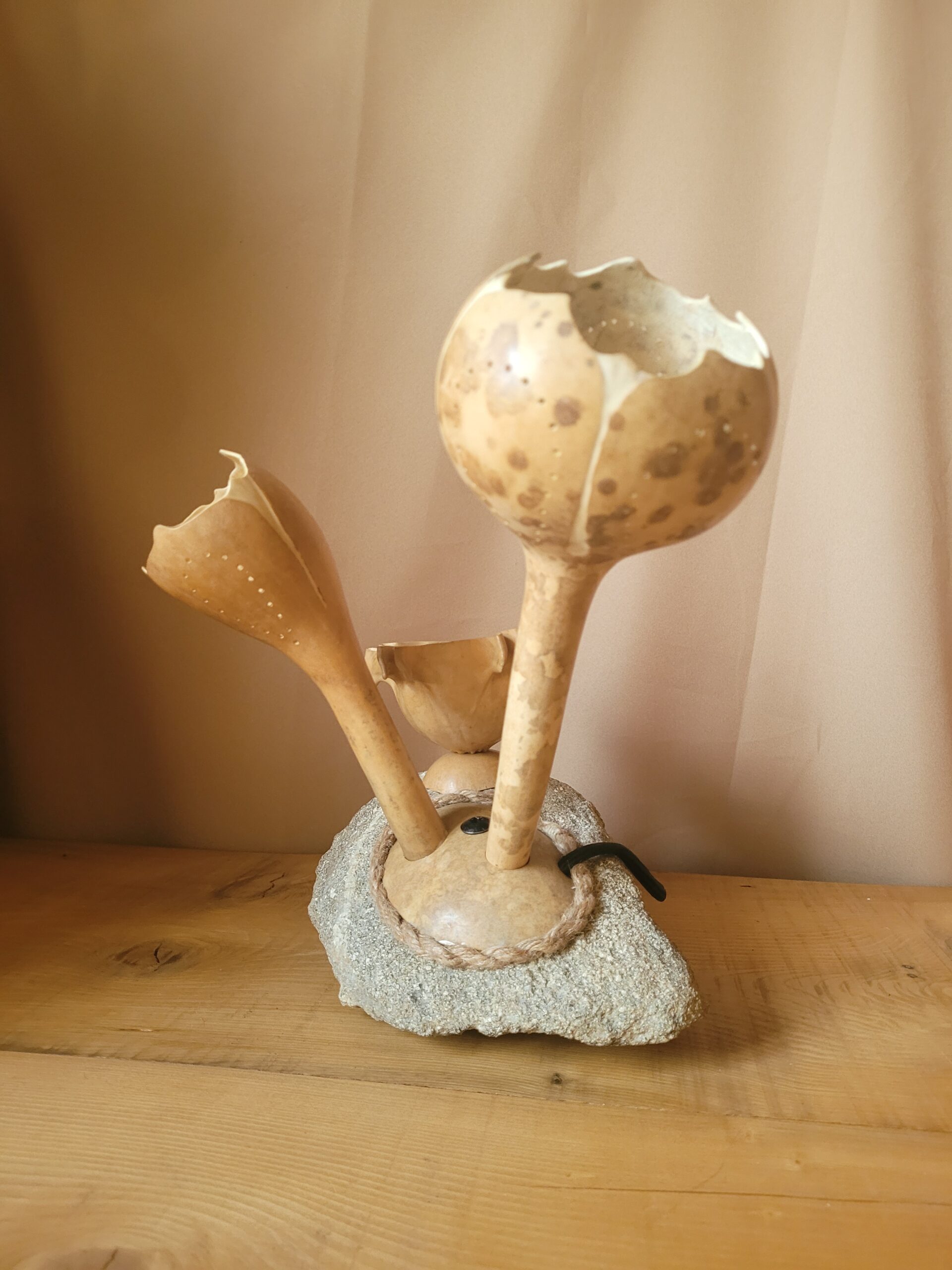 Toutes les créations sont des pièces uniques, de par le hasard de la nature, chaque courge, pierre, bois sont de couleurs formes, tailles différentes….