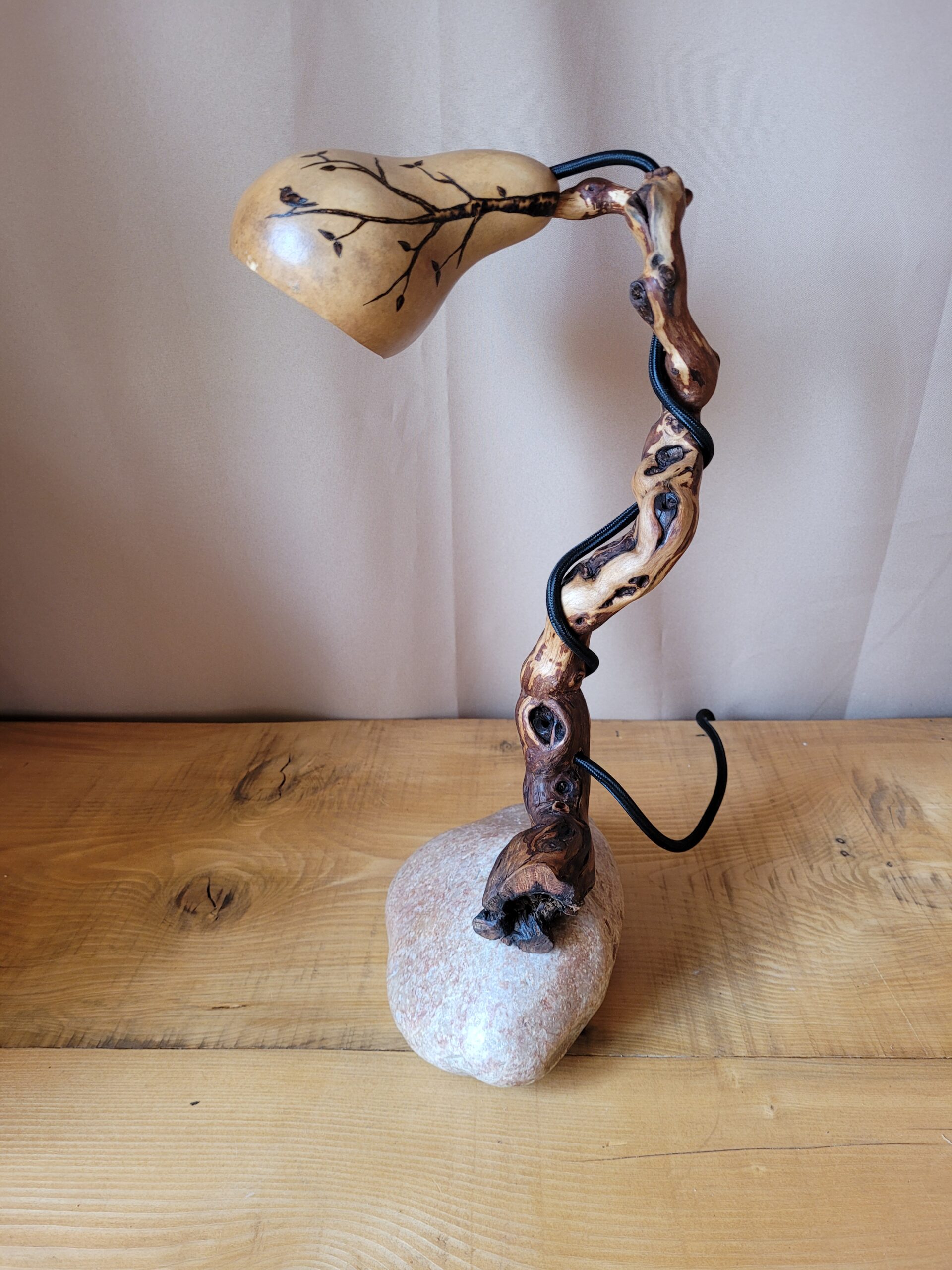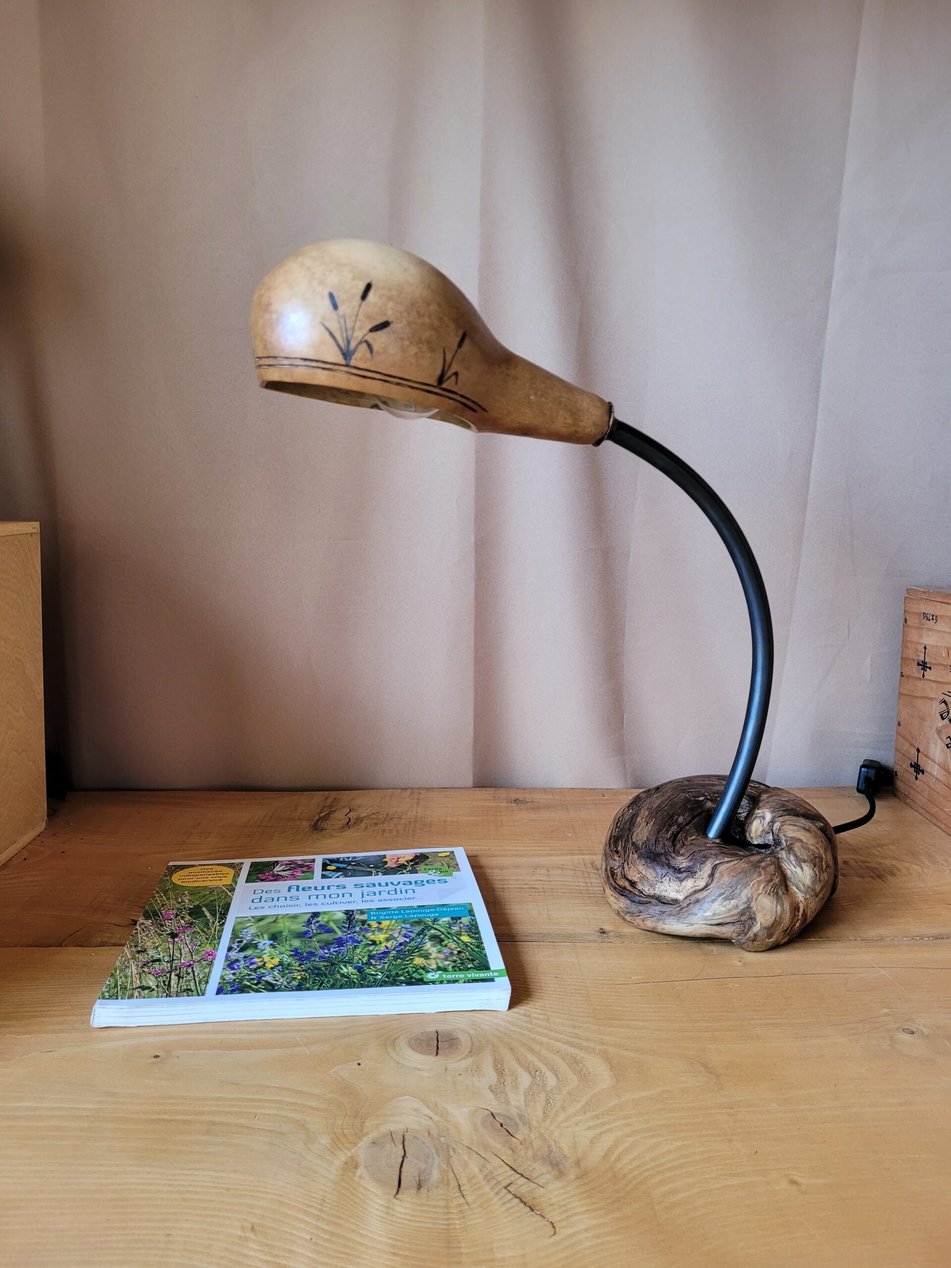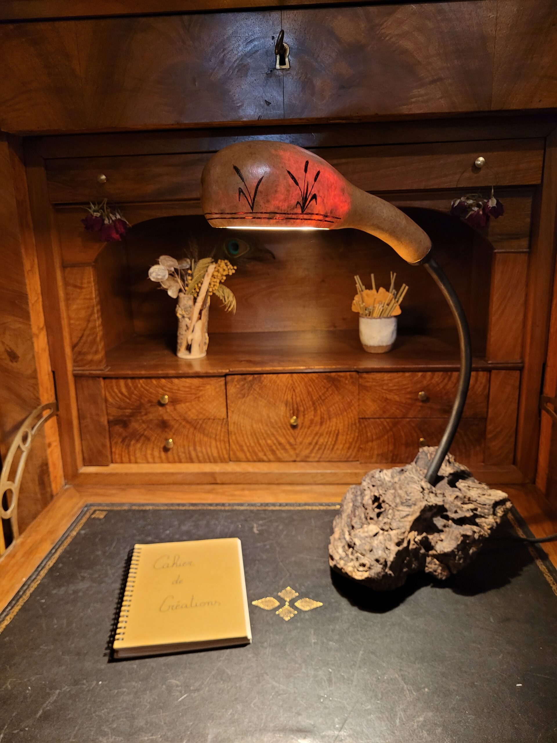 Toutes les créations sont des pièces uniques, de par le hasard de la nature, chaque courge, pierre, bois sont de couleurs formes, tailles différentes….